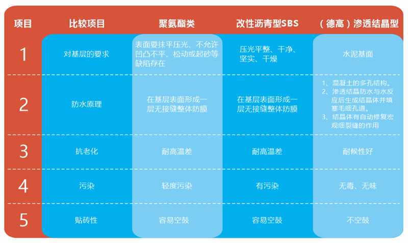 各種防水涂料性能比較