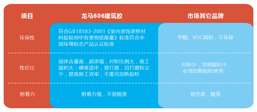 龍馬606建筑膠與其它市場品牌對比